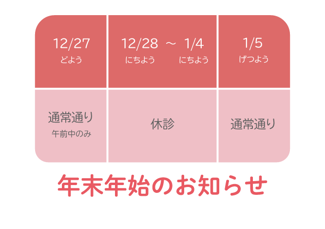 午前の診療は12:00にて受付終了、午後の診療は17:30にて受付終了です。